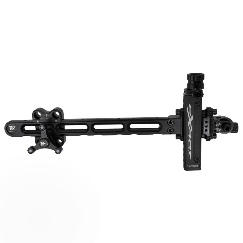 The Exact Target comes in at just 8 ounces (scope not included). It features an 8” extension bar with our click-in precision locators, and a slow-pitch elevation rod for precise yardage settings. There are 6 macro-elevation positions for vertical body, combined with 2 1⁄2 inches of travel.